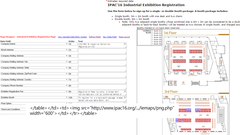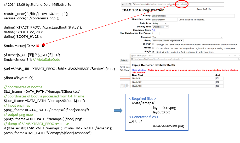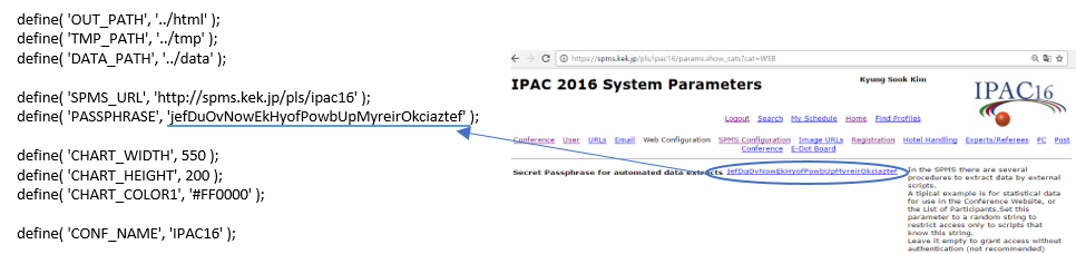 How to Integrate SPMS Data into Your Conference WebsiteContact: Kyung Sook Kim (Pohang Accelerator Laboratory) This session shows how to pipe SPMS data in your conference website using PHP script. Following description is based on the experience of IPAC'16. Basic Procedure and ScriptsMain scripts - conference.phpIndustrial booth status - png.phpRequired booth map and coordinatesGenerated booth map and SPMSCharts and List of Participants
