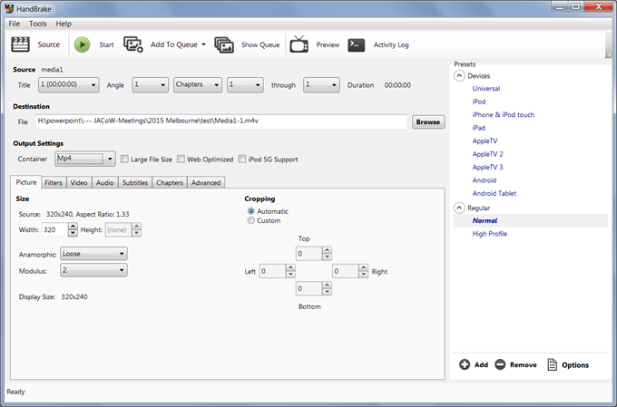 Processing Video Files with Handbrake![]() Handbrake is the standard tool which has been used to transencode an existing video into a compliant *.m4v, or *.mpg with the H.264 encoding so that it can be embedded into the PDF. Note: Transencoding just means re-encoding from one format to another. To use this tool with default installed settings you need to;