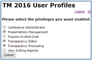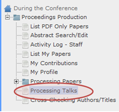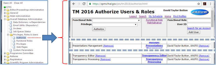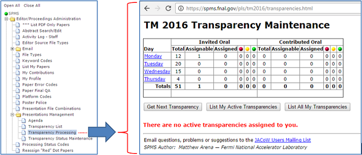 See Fig.2 flow chart of typical procedure. ![]() Figure 2: This is the flow diagram of the procedure used by Transparency Editors to process slides. This process is a time-consuming job, especially for embedded movies and animated GIF’s as each item has to be converted and embedded individually. SPMS Privileges for Slide ProcessingThe delegation of privileges within SPMS can only be completed by a SPMS instance user who has Conference Administration privilege. As the Administrator you need to navigate to Overall Database Administration > Privileges, Roles & Users > Authorize page, note once the privileges have been changed for the user they must log out and back in again to activate this privileges. See Fig. 3. ![]() Figure 3: Each Functional Role should have the Privilege added; each role Presentations Management, Transparency Editor, and Transparency Processing' should have the User added who is tasked with the presentation processing. SPMS Login PrivilegesOnce the privileges have been allocated like all changes in user privileges you will have to logout and back in again. When logging in you should select the privileges shown below in Fig.4. ![]() Figure 4: When the presentation processing staff login they must select the above privileges to be able to use the required features in SPMS. SPMS Processing SlidesIf you have not logged into SPMS with the above mentioned permissions please logout and activate the privileges mentioned above. To start processing the slides you need to select in the menu Presentation Management > Transparency Processing This is shown in Fig. 5 below. ![]() Figure 5: This is the page that you will process slide/transparencies from. When you can revise the table in Fig. 5 to see if the transparencies are available. You only process transparencies which have been presented. The functionality of processing slides is similar to that of processing paper, in Fig. 5 you Click On Get Next Transparency. After clicking of the Get Next Transparency button you will be displayed the screen below in Fig. 6. This screen gives you access to the presentation that you will process, the main functions on this screen to point out are;
