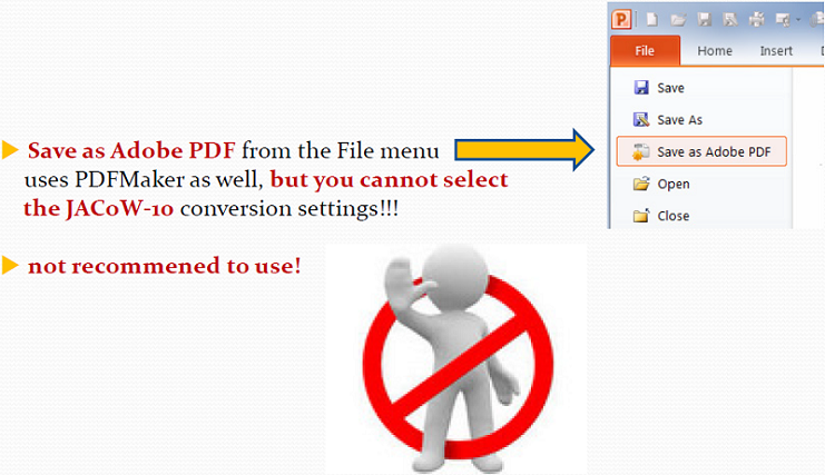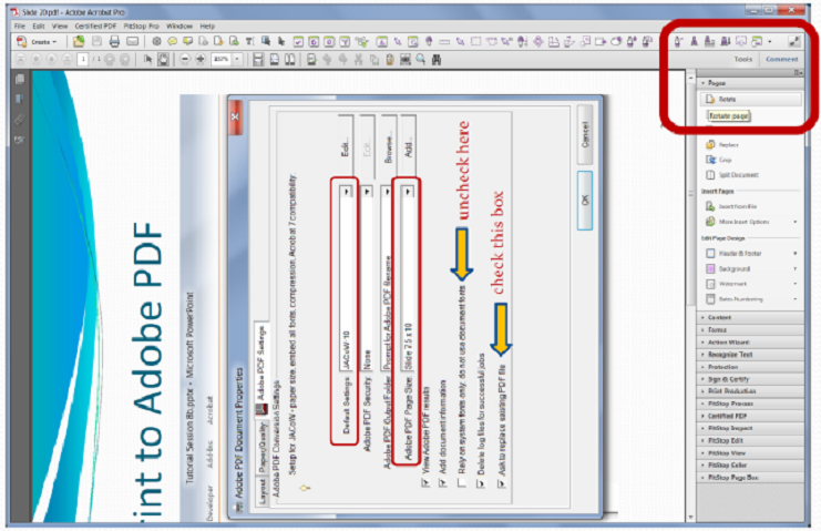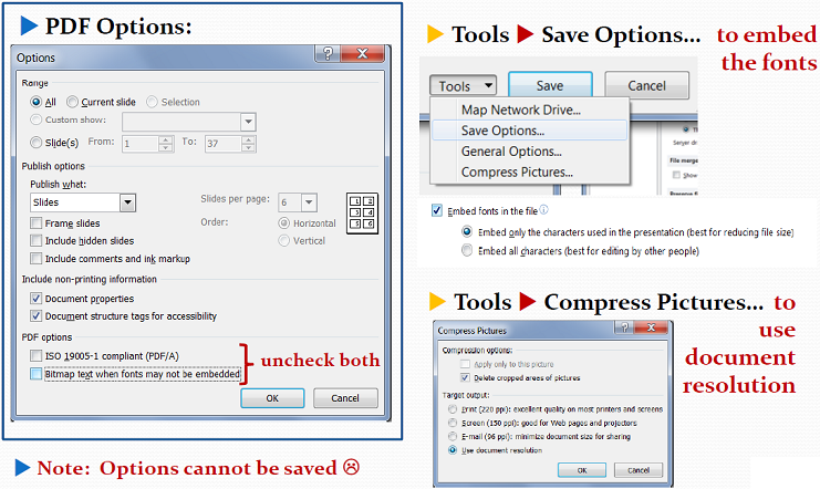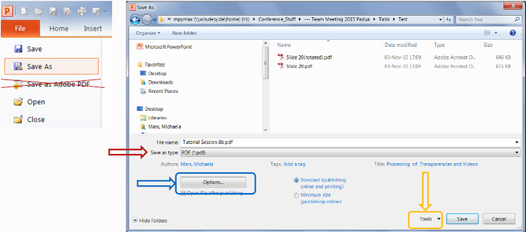 ![]() If you have used this method to produce the PDF you will need to open the PDF and rotate it within Acrobat and re save. This is done with the Page Rotate Tool. See below. ![]() Save As PDFWhen using the Save As method, be careful not to select Save as Adobe PDF, select the actual Save As. In the Save As Screen make sure to Select Save AS Type: PDF (*.pdf), go into Options and Tools to emabed the fonts and compress pictures to document resolution. This can all be seen below. ![]() ![]() Acrobat PDFMakerAdobe PDF Maker is a nice tool which integrates into the MS PowerPoint ribbon, and menu system. However Do Not us the menu based Save as Adobe PDF as it dose not give you the option of changing the preferences. If Adobe Media Encoder is installed this process has the bonus of embedding some videos directly into the PDF. This is demonstrated below. ![]() ![]() Why So Many Ways to Make a PDF?As you process slide you will find cases where one process of generating the PDF will have errors in it, but when using an alternative method it seems to give the expected result. Below is an example of a slide which was converted to a PDF with the Print, and Save As method. Note that layering of the logo in the left hand side is incorrect in the Print as PDF method verses the Save As PDF method. Splitting Slide AnimationsWhen reviewing a PowerPoint presentation you walk through the presentation and observe the behavior of the PowerPoint animations. It is important to remember that when you produce a PDF all the Transitions and Animations are lost or flattened. To get the same effect of item appearing between Clicks can be achieved with duplicates of the slides being created and incrementally building to the final configuration of the slide. Some authors will construct there slide in an additive manner so items appear on the screen into regions which are free of overlap, such for example when paragraphs of text are hidden before they are discussed. These slides typical do not need any modification before producing the PDF version. Some slides however have the artistic licence by which during the presentation new items or text may obscure or overlap on other content, this is shown bellow. ![]() Before Click ![]() After Click There are 3 ways to resolve this problem.