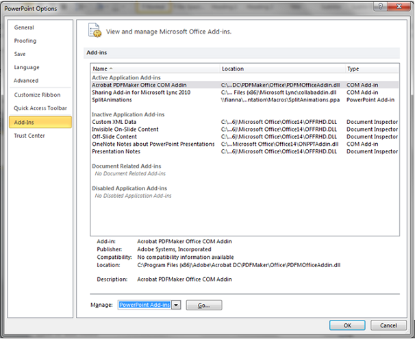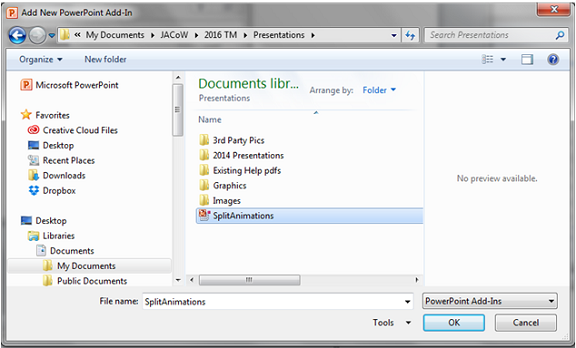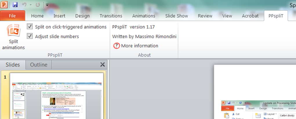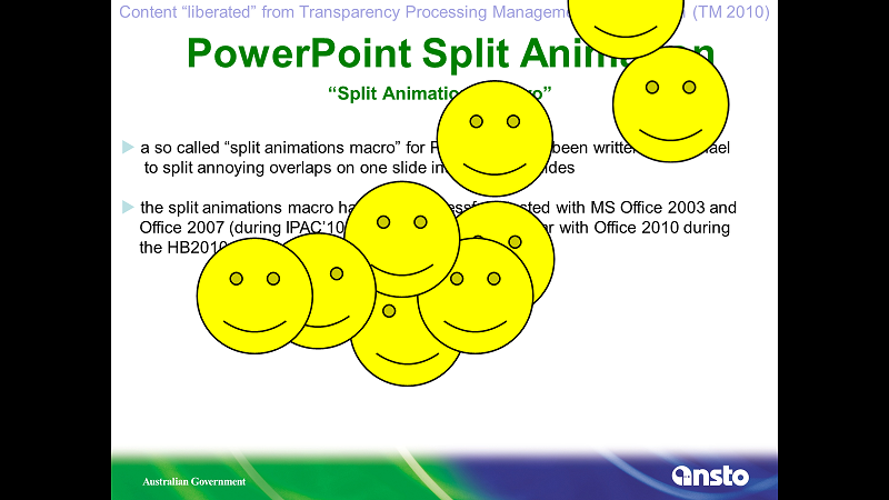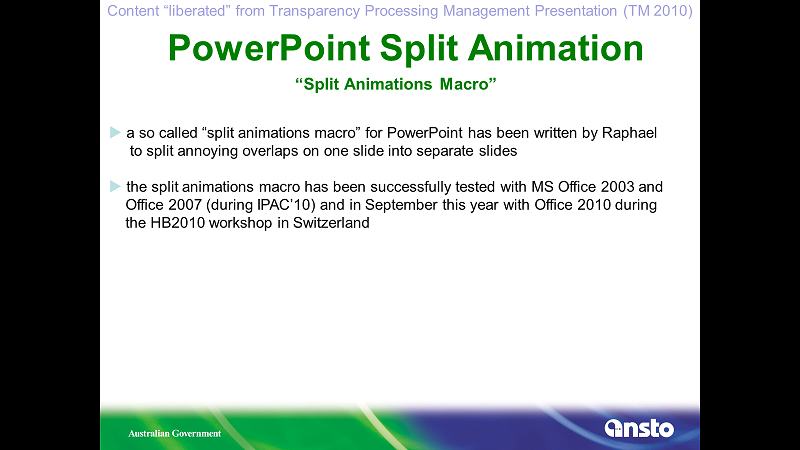 Configuring PowerPoint Split Animations Add-InThe PPspliT PowerPoint Split Animation Tool can be downloaded from here PPsplitT. The zip file password is:“ppsplit” All credit to the author of the Add-In After installing the PPspliT Add-In and restarting your copy of PowerPoint you will have a new ribbon strip with splitting tools. Old Split Animation ToolAfter downloading the Split Animations Add-in you need to add this to your local copy of MS PowerPoint. To do this in goto File > Options > Add-Ins > [Manage: "PowerPoint Add-ins"] Press Go ![]() ![]() In the popup menu, if SplitAnimations is there make sure it is checked, if not there click Add New, then browse and select the before downloaded SplitAnimations.ppa file. Confirm all the screens, now you should have a new Icon on the Add-Ins ribbon. The Process of Editing Slides:Slide Presentations Processing deals with one part of what is typically a two part submission by the Author. The Author will upload into SPMS their paper submission which is processed by the Conference Editors also known as the Saltmine’s Team who work in the Proceedings Office, and as part of that team is the Transparency Editor who either conducts this role as their sole activity, or swap into this role during the course of proceedings processing. See Fig.1 below. The Proceedings Office is managed by the Chief Editor and should help moderate work flow. The Process of Editing Slides(Cont.): Figure 1: The simplistic Life Cycle of an Oral Presentation in relation to production of proceedings. Note: The term Presentation Editor and Transparency Editor are regularly interchanged as prior to Digital Projection of Slide Presentations authors who use transparent film slide on an Overhead Projection system. Presentations processing only apply to oral presentations, and are conducted after the presentation has been presented. It is not untypical for Authors to request that some slide and images be removed from their presentation during or before. This may be due to issues such as patient confidentiality in the case of Hadron Therapy presentations for example. The goal of the Transparency Editor is to produce pdf files which have all fonts embedded, as well as relevant video media uploaded to the Conference SPMS instance File Server for inclusion into the final Proceedings. Procedure of Processing SlidesAs with other activities the process of processing slides has been grouped into a Role in SPMS. These privileges have to be setup in SPMS by a SPMS Conference Administrator prior to enable this functionality to the Transparency Editor/s. Please see the section below which covers this. The procedure for processing slides is always the same,