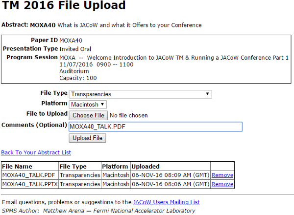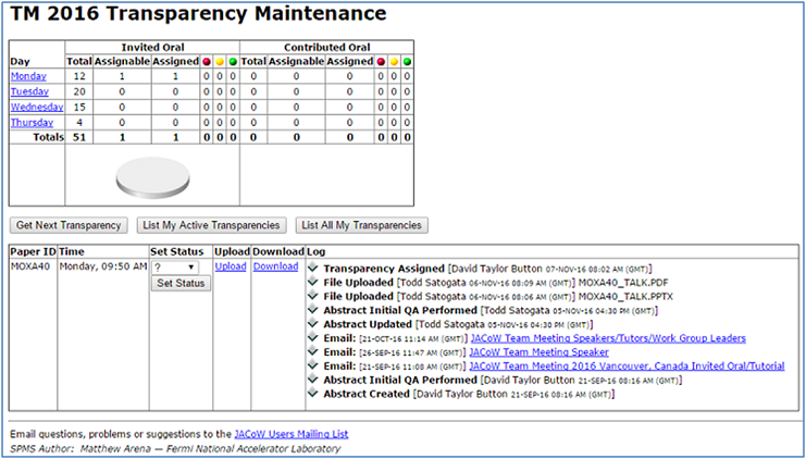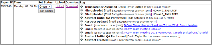 ![]() Figure 6: This screen gives you access to Download, Upload, and Set the Status of the presentation. Downloading TransparenciesBy Clicking on the Download link in Fig. 6, you will be given a new screen with the download options, if there is a PDF already provided by the author download this to review that it looks correctly, and that all the fonts are embedded. The download screen is seen below in Fig. 7. ![]() Figure 7: This page allows you to download the individual PDF, PPT, or PPTX files to process, or the ZIP bundle. Download the required files to your local work-space so that you can process them into a pdf, if the author has not provided a PDF. Even if the author has provided a PDF, it must be checked for visual correctness including poor graphics, missing characters, and font embedding. This is very much the same as processing papers in this regard. Uploading Transparencies (Talk)By Clicking on the Upload link in Fig. 6, you will be given a new screen with the upload options see Fig. 8. In this screen you Must Select File Type Transparency, the file that you are uploading must be named "Paper ID_TALK.PDF", for example: "MOXA40_TALK.PDF". To upload your prepared PDF, first find it on your local drive by Clicking Choose File, fill in any optional comment, and Click on Upload File. ![]() Figure 8: This page allows you to upload the prepared PDF to the SPMS file server. Setting Transparency StatusOnce you are happy with the new PDF file that you have uploaded you can set the "Transparency Status" to GREEN, unlike papers where the production of a PDF from the source requires you to set the status to YELLOW with transparencies you go to GREEN. Typically you will email with an Author if there are any issues, but you can choose to set the status to RED if you wish. To set the status you simple select the Status from the drop down box, and Click on Set Status button. see Fig. 9 below. Figure 9: This basic menu allows you to set the Status of a transparency to either GREEN, YELLOW, or RED. Producing PDF of TransparenciesThe aim of the Presentation Processing Editor is to produce JACoW compliant PDF files of the presentations for inclusion in the proceedings. In the case of the presentations you do not have to edit the type setting or layout of the paper against the JACoW template, but you still have to make sure of the following;