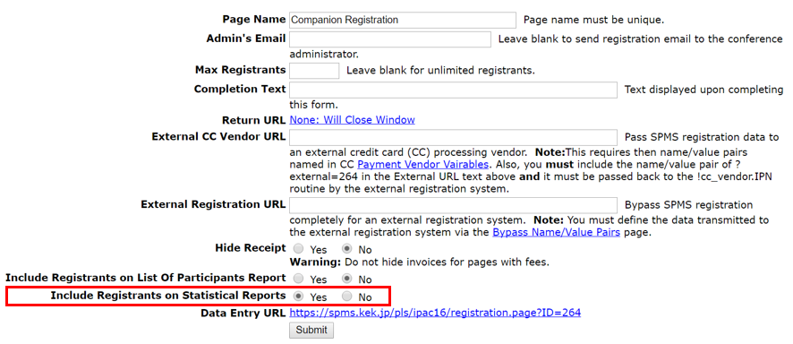 Script Each script has its own section in the configuration file, usually it is not needed to change the default values. SPMS configuration for Registrants' ChartDependency: "Include Registrants on Statistical Reports" flag in the registration page properties of the SPMS. ![]() SPMS configuration for Participants PageDependency: "Include Registrants on List Of Participants Report" flag in the registration page properties of the SPMS. ![]() CronThe data into the SPMS are continuously updated so the scripts must be executed periodically. To simplify this task the package provides the script cron.php that reads the configuration file and executes each script at the right time. The global setting cron_enabled enables or disables this script. The cron parameter available in the script section of the configuration file controls when to run it. Some examples: 'spms_stats_importer' =>array(
