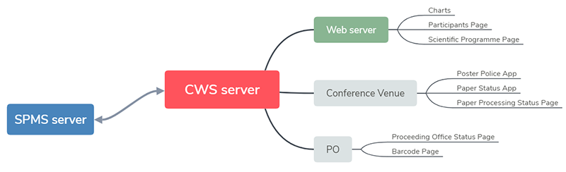 Conference Website Dynamic Data Inclusions, Conference Tools, and Information ScreensContact: Stefano Deiuri - Elettra-Sincrotrone Trieste S.C.p.A. This talk will showcase the variety of SPMS generated reports which can be included in your conference website and are automatically updated as data evolves is your SPMS instance. A number of useful applications for poster police, doting boards, and other information screens will be showcased. HistoryThe ConferenceWebsiteScript was developed ten years ago for the EPAC'08 conference, the goal was to automatically create some contents for the website. Year after year these scripts have been updated and improved, and they now provide tools for other aspects of the conference. Scheme![]() In this scheme the CWS server and Web server are separated but in case you manage the website these can also coincide. InstallationClone the scripts to your server (ex. /var/www/html/) with this command git clone http://git.code.sf.net/p/jacow-spms/cws jacow-spms-cws Directory structure